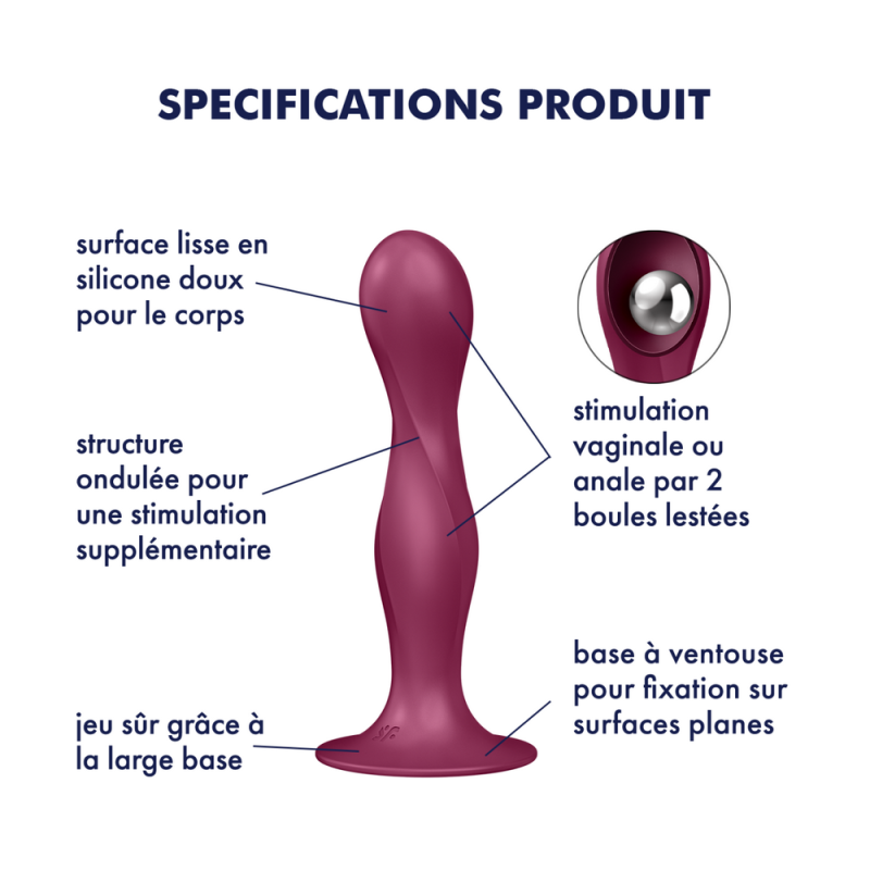 Gode ventouse Satisfyer Double Ball-R : sans aucune vibration ni batterie, deux boules lestées à l’intérieur font vibrer ce gode anal et vaginal, et chaque mouvement, aussi petit soit-il, crée une sensation d’excitation incomparable. Pour encore plus de flexibilité, le Double Ball-R est équipé d’une large base à ventouse que vous pourrez fixer sur toutes les surfaces lisses.