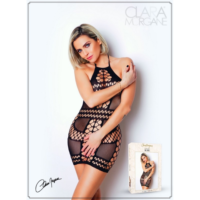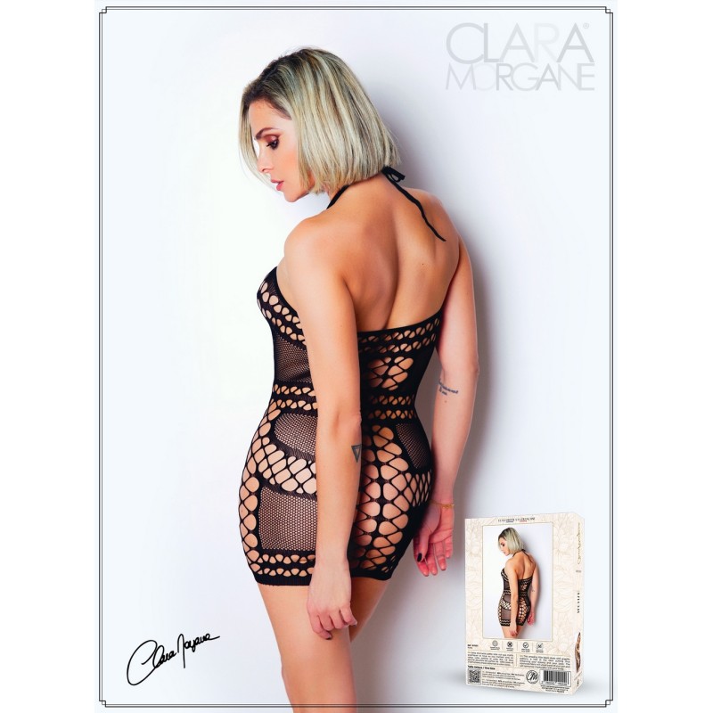 Cette petite robe noire Clara Morgane, saura vous séduire, ajourée là où il faut pour éveiller les sens les plus érotiques, L’attache dans le cou.