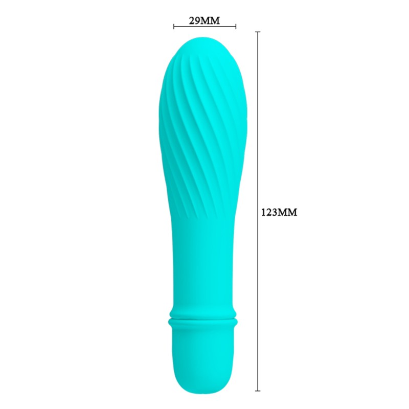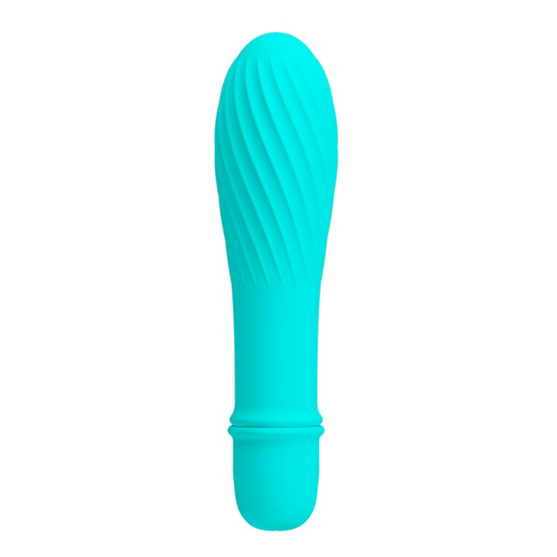Mini vibromasseur en silicone turquoise avec ses 10 fonctions de vibrations.